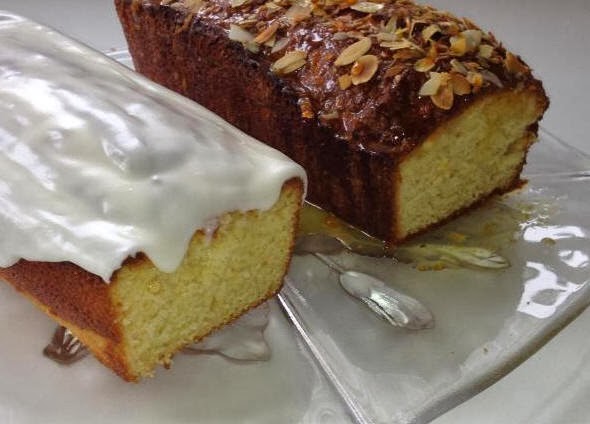 Hrærið saman flórsykri, sítrónuberki, appelsínusafa og sítrónusafa. Blandan á að vera þunn og fljótandi svo hún bleyti upp í kökunni. Hellið yfir kökuna án þess að allur glassúrinn leki niður hliðarnar.